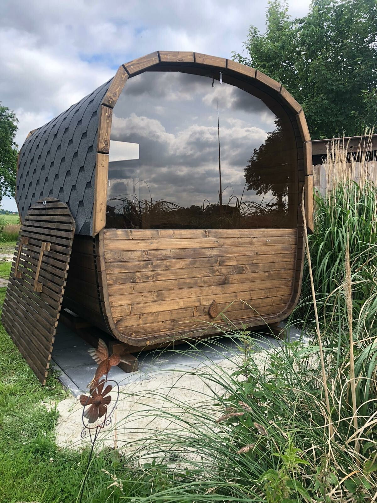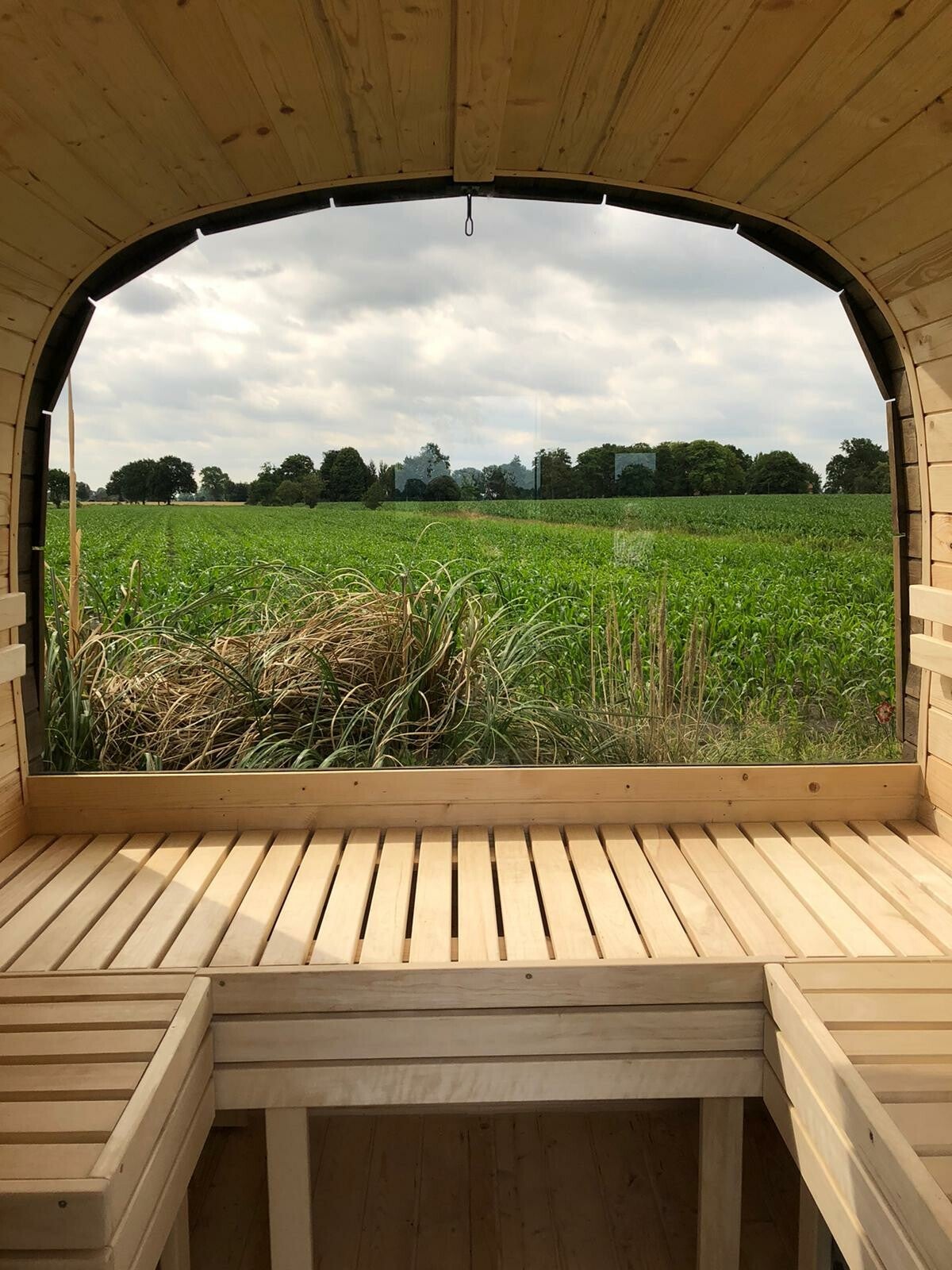 Ungewöhnliches Aussehen der Fasssauna, die sogar Ihre Familie und Freunde überraschen und begeistern werden.